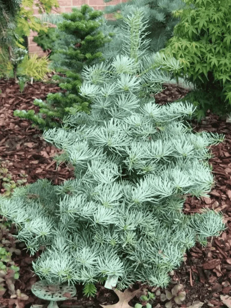 Пихта одноцветная сорта *Argentea* представляет собой стройную пирамидальную красавицу с серебристо-голубым нарядом иголок, словно покрытых тонким слоем драгоценной пыли. Её ветви расположены горизонтально, слегка свисают книзу, придавая дереву благородство и величие. Иглы короткие, мягкие, густые, блестящие, будто выточенные искусным мастером из полированного серебра. Крона компактна, симметрична, идеально подходит для украшения садов и парков. Растёт медленно, предпочитая влажные почвы и тенистые места, где её нежность раскрывается во всей красе. Цветение скромное, шишки небольшие, тёмно-коричневые, почти незаметные среди роскоши хвои. Этот сорт пихты очаровывает своей изысканной простотой и утончённой красотой, превращаясь в истинное украшение любого ландшафта.