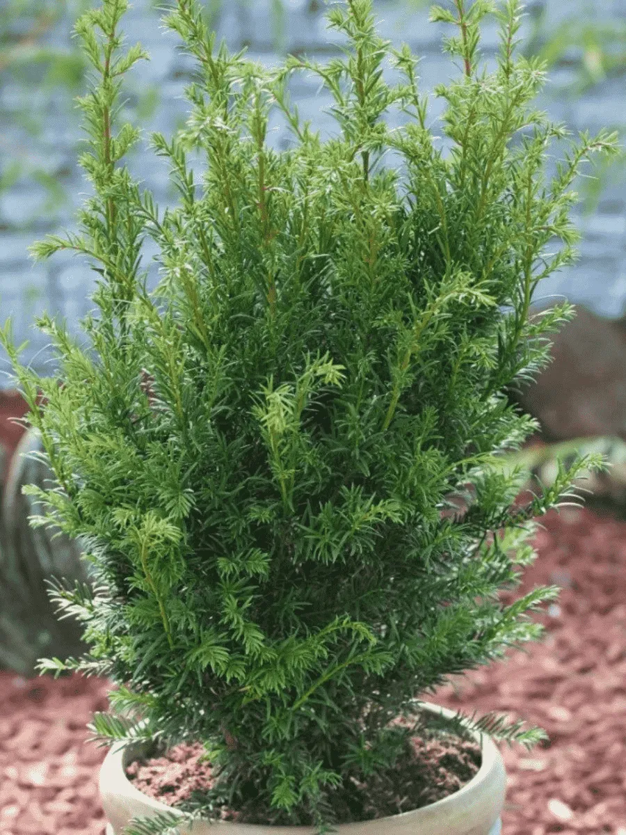 Тис средний сорта **Groenland** представляет собой вечнозелёную декоративную хвойную породу, отличающуюся компактной пирамидальной формой кроны и медленным ростом. Его густые ветви покрыты плотной тёмно-зелёной хвоей игловидной формы длиной около одного сантиметра, придающей растению благородный строгий облик даже зимой. Хвоя мягкая, слегка загнутая внутрь, обладает приятным ароматом и сохраняет свежесть круглый год. Цветёт растение незаметно мелкими невзрачными цветами, однако основное достоинство вида заключается именно в красоте густой зелёной листвы и аккуратности форм. Благодаря своей неприхотливости, устойчивости к загрязнённой городской среде и теневыносливости, этот сорт широко используется в ландшафтном дизайне парков, садов и частных участков, где создаёт атмосферу спокойствия и гармонии.
