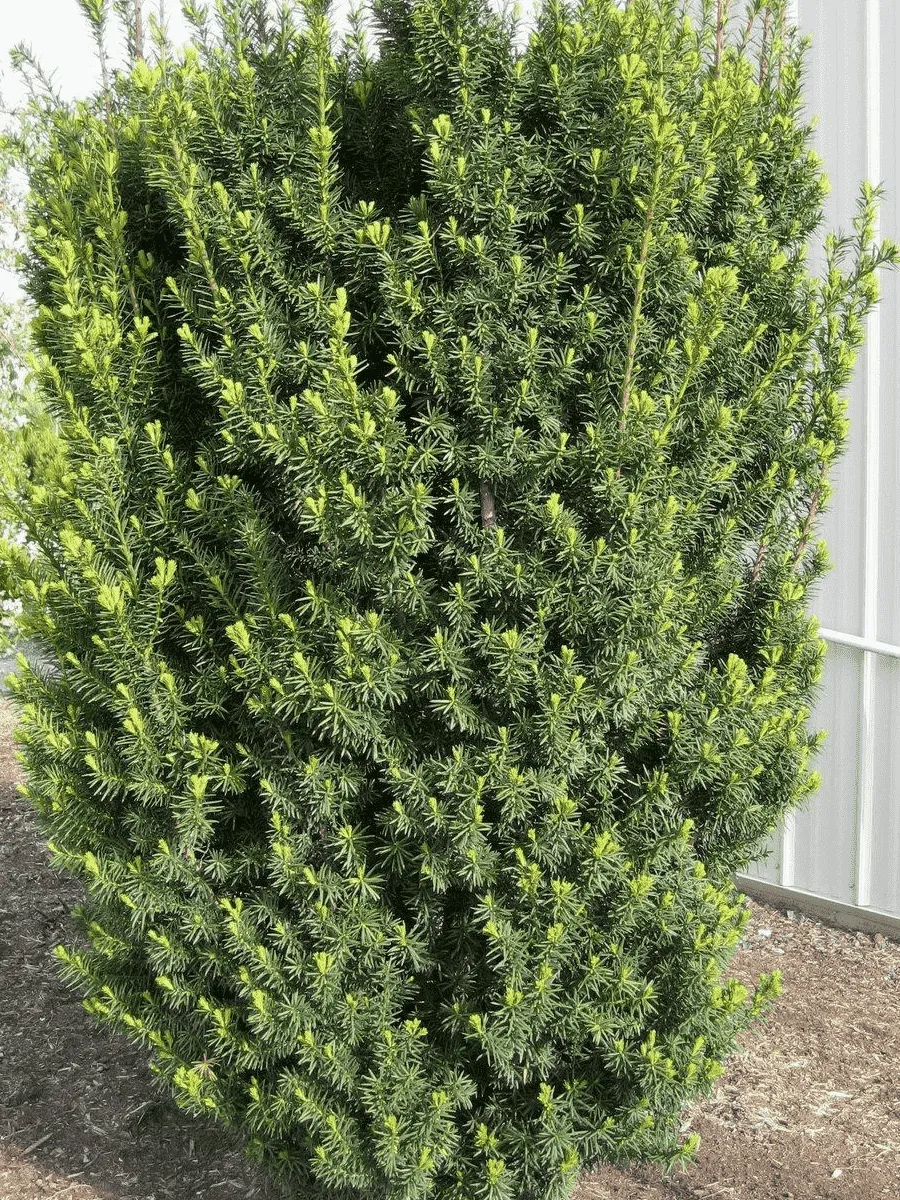 Тис средний сорта *Hicksii* представляет собой вечнозелёную хвойную породу, отличающуюся медленным ростом и компактной формой кроны, достигающей высоты до трёх метров. Его густые ветви образуют плотную пирамидальную крону, придающую растению строгий и благородный облик. Листья игловидные, короткие (около одного сантиметра), тёмно-зелёные сверху и серебристо-сизые снизу, расположены спирально вдоль ветвей, создавая эффект мягкого бархата. Растение отличается теневыносливостью и зимостойкостью, прекрасно переносит городские условия и стрижку, благодаря чему широко используется в ландшафтном дизайне для формирования живых изгородей и декоративных композиций. Цветёт редко, цветки мелкие, невзрачные, скрытые среди густой хвои, однако декоративная ценность заключается именно в красоте самой зелени и её способности сохранять свежесть круглый год.