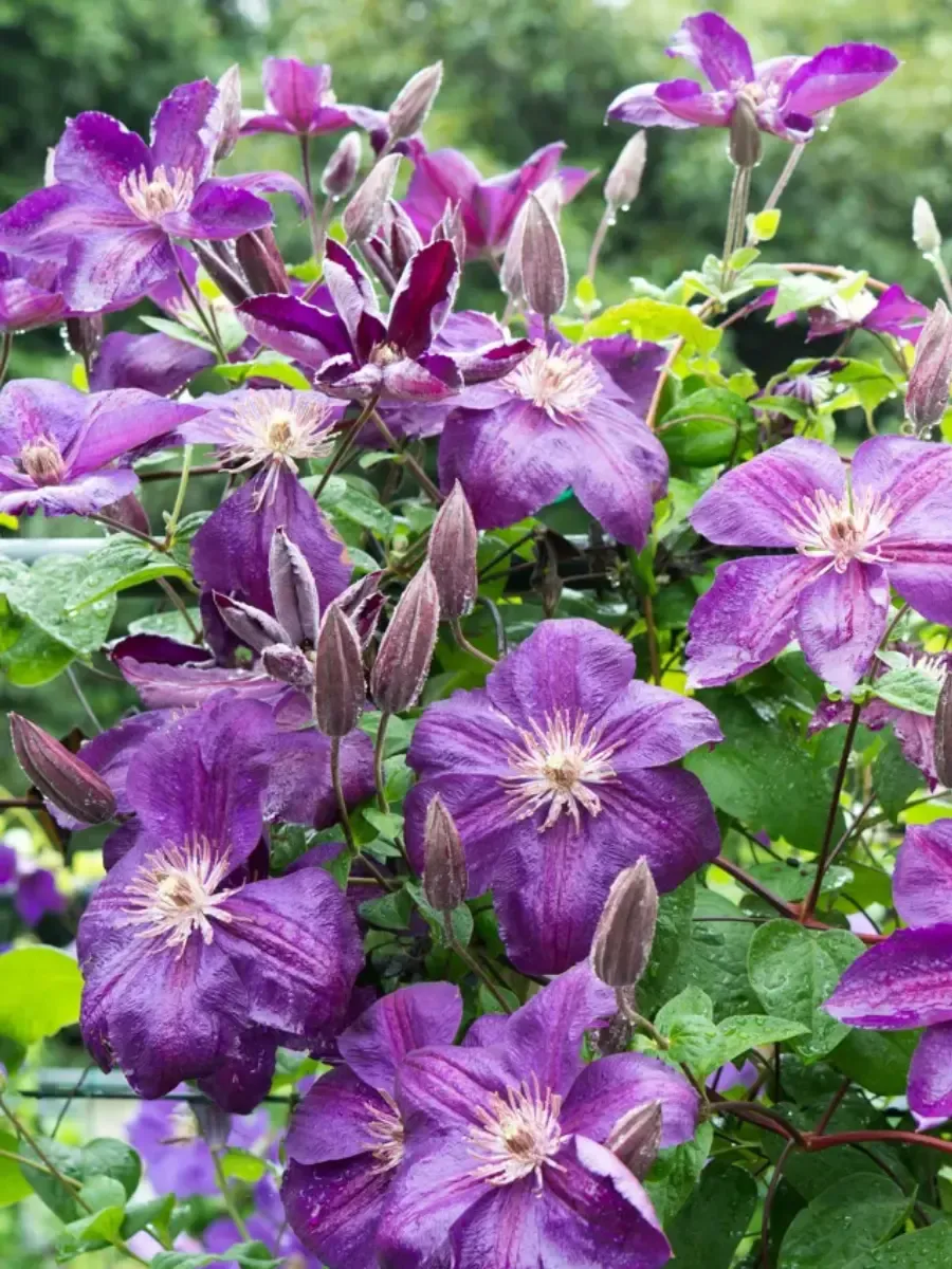 Клематис гибридный *Night Veil* пленяет взор роскошной палитрой тёмно-фиолетовых оттенков, словно ночное небо, покрытое бархатом таинственных звёзд. Его крупные цветки диаметром до 15 см раскрываются во всей красе летом, демонстрируя элегантную чашечку из четырёх широких лепестков, плавно переходящих от глубокого пурпурного оттенка к едва уловимому синевато-чёрному краю. Листья растения рассечённые, перисто-сложные, состоят из нескольких овальных листочков насыщенного зелёного цвета, придающих облику куста свежесть и лёгкость. Стебли гибкие, длинные, легко цепляются за опоры благодаря тонким усикам, позволяя растению уверенно подниматься вверх, достигая высоты около трёх метров. Этот клематис предпочитает солнечные места, защищённые от сильных ветров, прекрасно чувствует себя на плодородных почвах и радует садоводов продолжительным периодом цветения, украшая собой сады и террасы вплоть до поздней осени.
