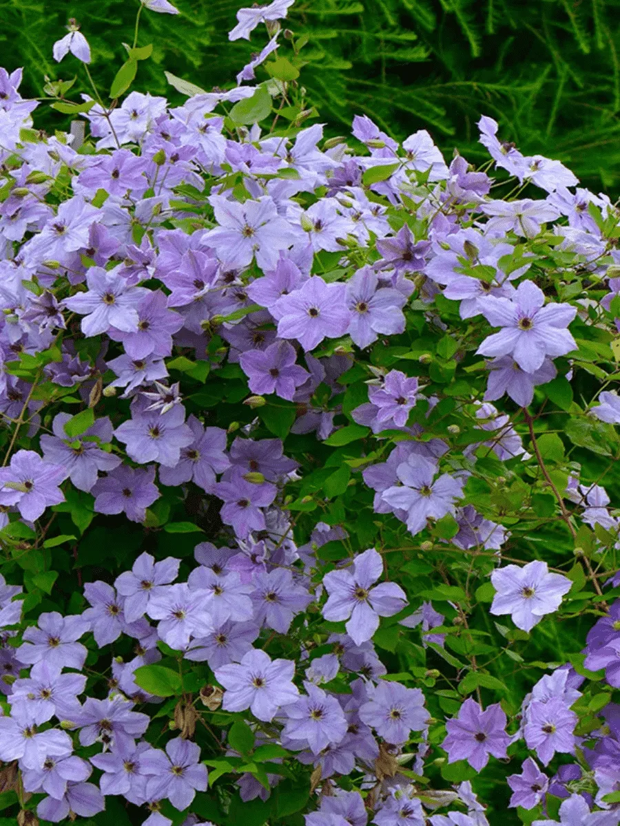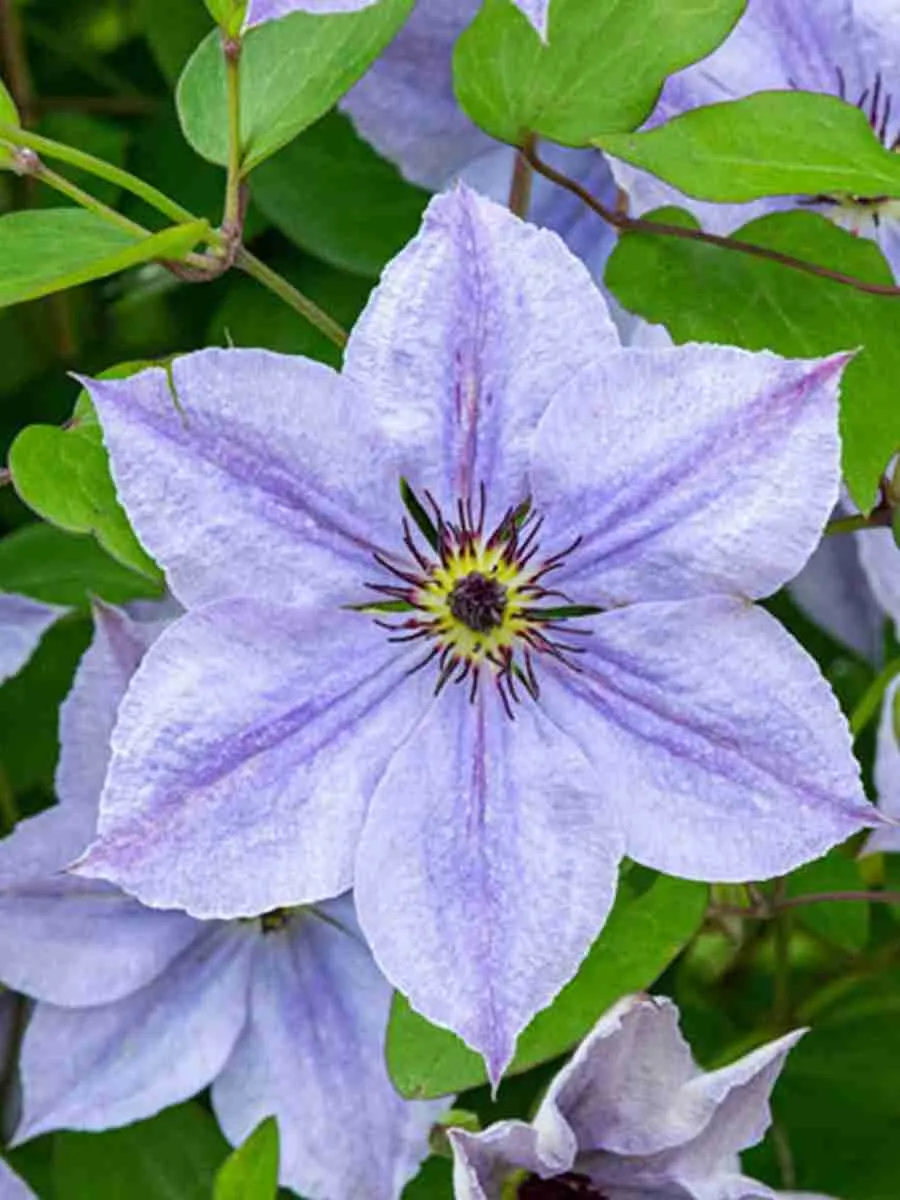 Клематис Skyfall очаровывает своей утончённой красотой и элегантностью форм. Это мощная лиана с гибкими побегами, достигающими трёх метров длины, легко взбирающаяся вверх благодаря крепким усикам-листочкам. Листья тёмно-зелёные, блестящие, рассечённые на три овальных сегмента с волнистым краем, придающие растению благородную пышность и густоту кроны. Цветки крупные, диаметром до десяти сантиметров, распускаются обильно и продолжительно, начиная с июня и заканчивая сентябрём. Лепестков пять-шесть, широкие, бархатистые, глубокого сине-фиолетового цвета с серебристо-сизым отливом, словно отражающим небесную глубину. Сердцевина цветка украшена контрастной жёлтой серединкой из многочисленных тычинок, подчёркивая изысканность композиции. Растёт быстро, предпочитает солнечные места и плодородные почвы, широко используется в вертикальном озеленении садов и парков, где становится настоящим украшением ландшафта, притягивающим восхищённые взгляды ценителей прекрасного.