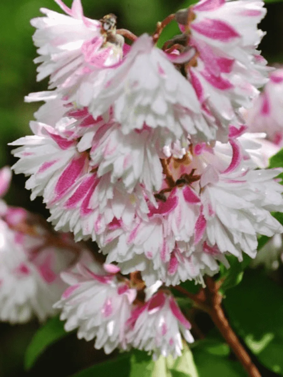 Дейция гибридная сорта *Rosea Plena* представляет собой элегантную листопадную кустарниковую форму высотой до двух метров, обладающую раскидистой кроной и гибкими побегами, покрытыми гладкой серо-коричневой корой. Листья овально-ланцетной формы, слегка блестящие, насыщенно-зелёного цвета, создают плотную ажурную листву, придающую растению благородство и утончённость облика. Особенную прелесть дейции придают её пышные соцветия, состоящие из множества махровых цветков нежно-розового оттенка, распускающихся в конце весны—начале лета и источающих тонкий аромат, привлекающий насекомых-опылителей. Цветки собраны в крупные рыхлые кисти, украшающие ветви густым облаком нежности и очарования. Растёт быстро, легко адаптируется к различным условиям среды, предпочитая солнечные места и плодородные почвы, широко используется в декоративном садоводстве благодаря своей неприхотливости и привлекательному внешнему виду.