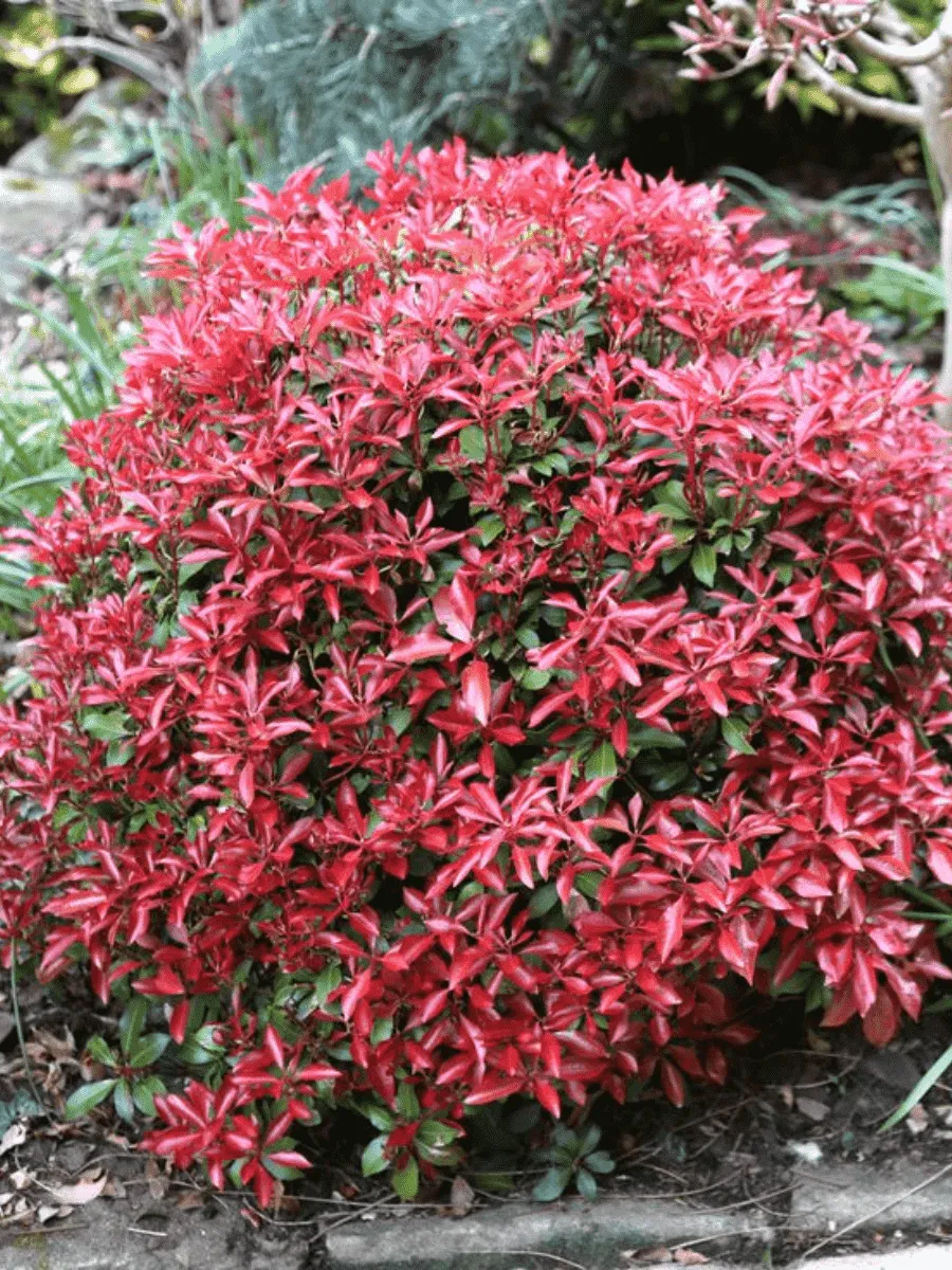 Пиерис японский сорта *Mountaine Fire* представляет собой эффектный вечнозелёный кустарник высотой до полутора метров с густой кроной и элегантной формой ветвей. Молодые листья весной окрашены в яркие оттенки оранжевого и красного цветов, постепенно приобретая насыщенный зелёный оттенок летом и бронзовый осенью. Листья продолговатые, гладкие, блестящие, слегка волнистые по краям, придают растению особую декоративность и изысканность. Цветёт пиерис ранней весной крупными кистями белоснежных колокольчатых цветков, источающих тонкий аромат, привлекающий насекомых-опылителей. Растение предпочитает полутень и влажную плодородную почву, хорошо переносит зимние морозы средней полосы России, создавая живописные акценты в садах и парковых композициях.