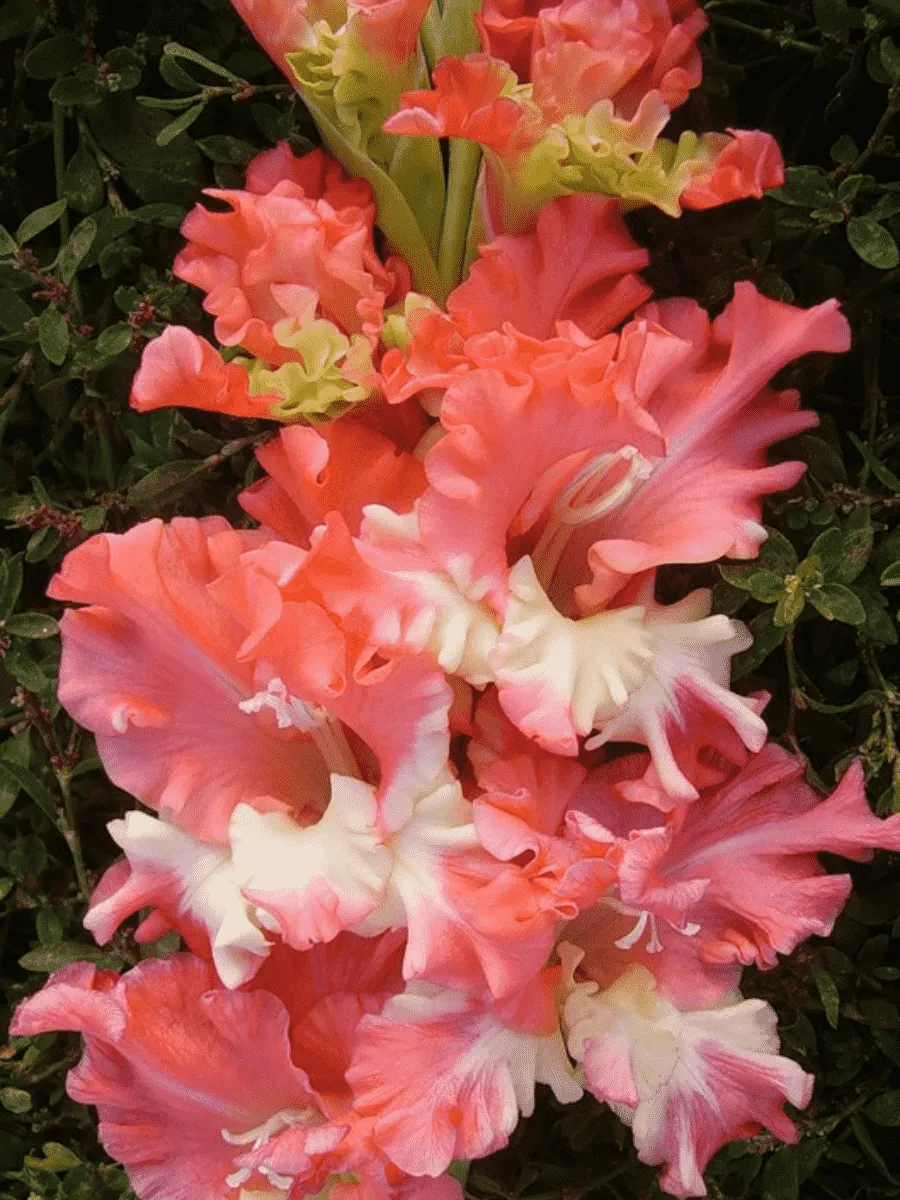 Гладиолус сорта *Frizzled Coral Lace* пленяет взор изысканным сочетанием нежности и элегантной строгости. Его высокие стройные стебли достигают метра высоты, увенчанные роскошными соцветиями, состоящими из множества крупных цветков, словно сотканных из тонкого кружева. Лепестки цветов слегка волнистые, нежно-розового оттенка с едва заметным коралловым отливом, придающим особую глубину и очарование каждому лепестку. Листья узколинейные, длинные и острые, насыщенного зелёного цвета, образуют пышную прикорневую розетку, подчёркивая вертикальную устремлённость всего растения. Цветёт гладиолус продолжительно, радуя глаз яркими красками с конца лета до первых осенних холодов. Предпочитает солнечные места и плодородные почвы, легко адаптируется к различным климатическим условиям, демонстрируя свою неприхотливость и способность украшать сады даже в регионах с умеренным континентальным климатом.
