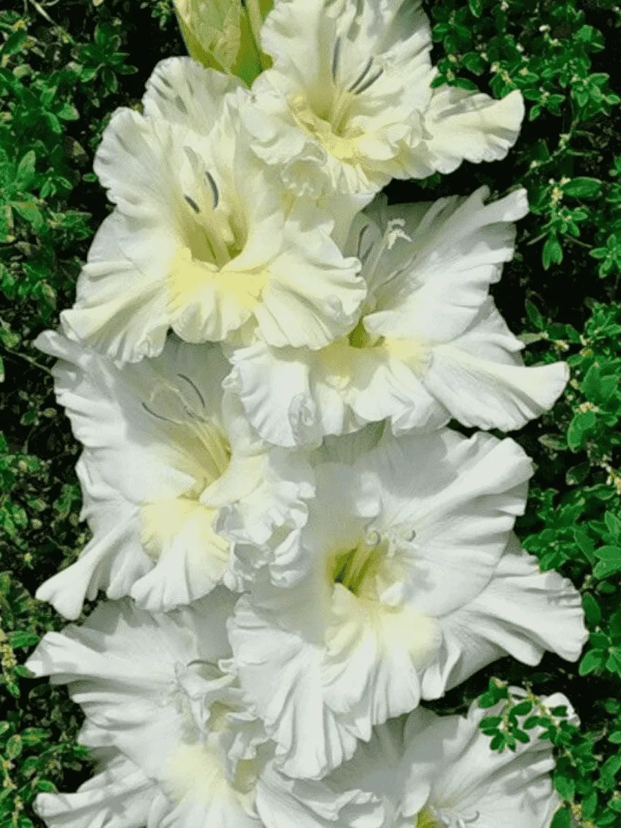 Гладиолус сорта «Мурманск» пленяет взор своей изысканной красотой и благородством форм. Высокий стройный стебель достигает метра высоты, увенчанный роскошной кистью крупных цветков, расположенных каскадом один над другим. Листья узколинейные, длинные и тонкие, словно зелёные мечи, устремлённые вверх, подчёркивая величественную вертикальность всего облика растения. Цветки крупные, диаметром около десяти сантиметров, раскрываются постепенно снизу вверх, демонстрируя всю палитру оттенков от нежнейшего кремово-белого до насыщенного золотисто-жёлтого цвета с едва заметными штрихами тёмно-коричневого тона вдоль лепестков. Бутоны имеют элегантную вытянутую форму, слегка загнутые назад края придают цветкам особую воздушность и лёгкость. Этот гладиолус предпочитает солнечные места и плодородные почвы, радуя садоводов своим продолжительным цветением с июля по сентябрь, когда каждый цветок сияет подобно маленькому солнцу среди зелени северных широт.