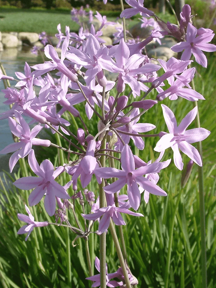 Тюльбагия Фиолетовая (Tulbaghia violacea), известная также как лиловый лук, пленяет взор нежностью своего облика и утончённостью аромата. Это многолетнее травянистое растение родом из Южной Африки обладает плотными зелёными листьями линейной формы, слегка мясистыми и покрытыми восковым налетом, придающим им благородную матовую поверхность. Листья собраны в прикорневую розетку, создавая живописный фон для эффектных соцветий. Цветки тюльбагии раскрываются небольшими зонтиками, состоящими из множества мелких трубчатых цветков нежно-фиолетового оттенка, украшенных белыми кончиками лепестков. Их аромат напоминает смесь ванили и мускуса, привлекающий внимание насекомых-опылителей. Растёт тюльбагия компактно, формируя аккуратные кустики высотой до полуметра, предпочитая солнечные места и хорошо дренированные почвы. Благодаря своей неприхотливости и декоративности она широко используется в ландшафтном дизайне, озеленении садов и городских пространств, радуя глаз своим изысканным видом и чарующим ароматом.