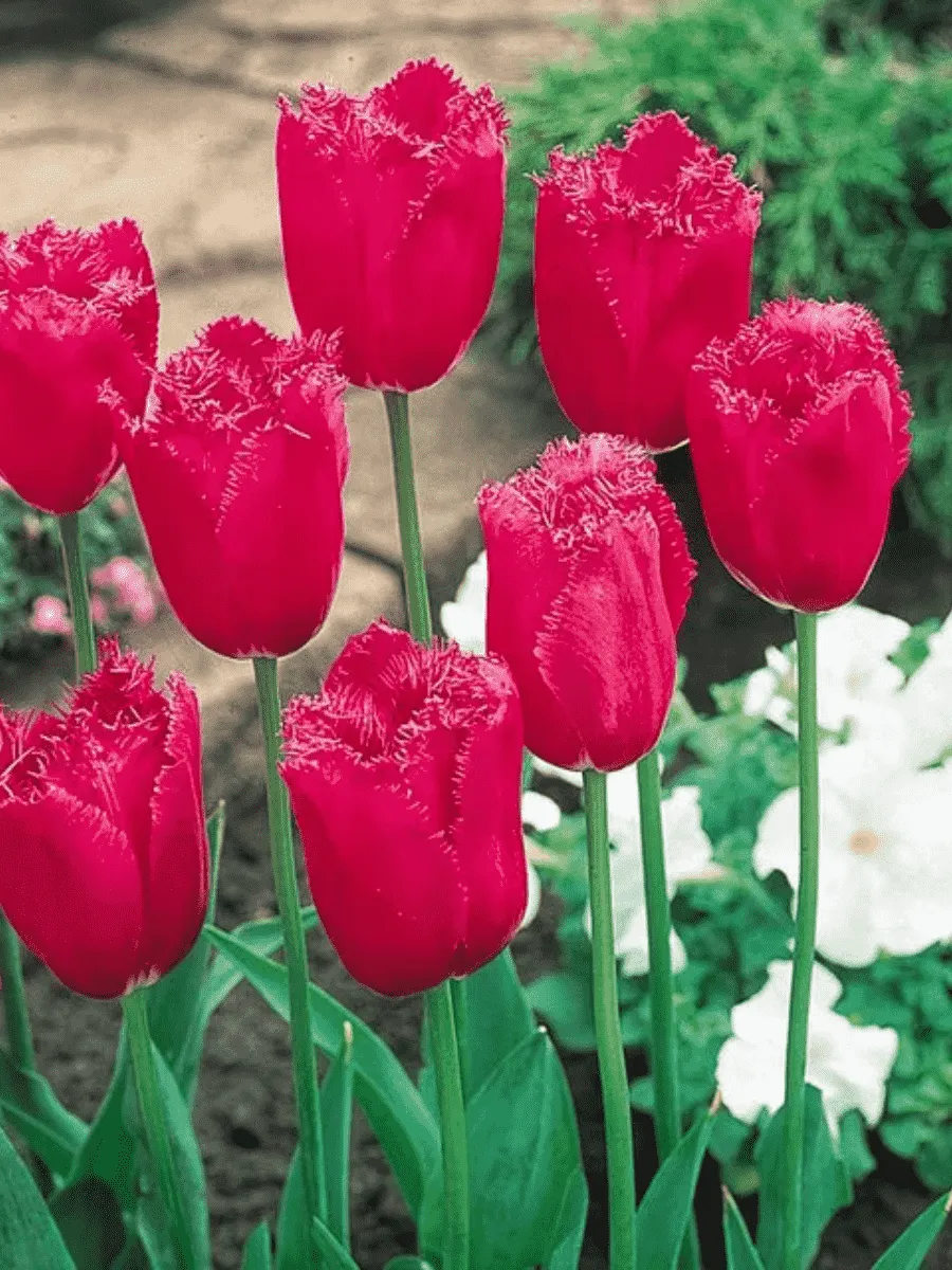 Тюльпан сорта *Burgundy Lace* пленяет изысканным сочетанием благородной тёмно-вишнёвой окраски лепестков и нежнейшей белой каймы, словно окутанной кружевной дымкой. Его крупные цветки раскрываются чашевидно, демонстрируя бархатистые внутренние поверхности, переливающиеся глубокими оттенками пурпура. Листья удлинённые, гладкие, насыщенно-зелёного цвета, подчёркивающие элегантность стебля высотой до полуметра. Цветёт тюльпан поздно весной, радуя глаз продолжительностью цветения и способностью сохранять свежесть даже после срезки. Предпочитает солнечные участки с плодородной рыхлой почвой, легко адаптируется к умеренному климату средней полосы России, где становится украшением садов и парков, создавая атмосферу утончённой роскоши и весеннего праздника природы.