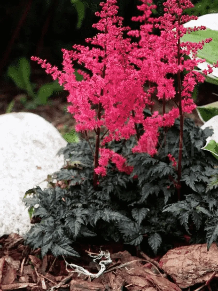 Астильба Арендса сорта *Hard Rock* пленяет взор своей изысканной красотой и благородством форм. Это многолетнее травянистое растение образует плотную куртину высотой около полуметра, украшенную крупными тёмно-зелёными листьями сложной формы, словно вырезанными искусной рукой мастера. Листья перисто-рассечённые, глянцевые, слегка блестящие, придают растению особую декоративность даже вне периода цветения. Но истинная магия раскрывается летом, когда появляются пышные метельчатые соцветия насыщенного пурпурно-красного цвета, возвышающиеся над листвой подобно огненным факелам. Цветки мелкие, многочисленные, собраны в рыхлые кисти, источающие тонкий аромат, привлекающий насекомых-опылителей. Растёт астильба быстро, легко разрастаясь и формируя живописные группы, предпочитая влажные тенистые места, где её красота проявляется во всей полноте.