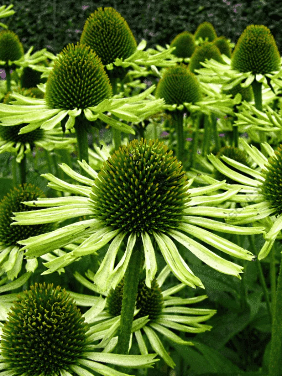 Эхинацея пурпурная сорта *Green Jewel* пленяет взор своей изысканной красотой и благородством форм. Это многолетнее травянистое растение достигает высоты от 50 до 70 сантиметров, обладая крепким прямостоячим стеблем, покрытым мелкими волосками. Листья крупные, овально-ланцетной формы, слегка морщинистые, насыщенно-зелёного цвета с лёгким серебристым оттенком, придающим растению особую декоративность даже вне периода цветения. Цветки эхинацеи поражают своим величественным видом: крупные одиночные корзинки диаметром около 10–12 см венчаются яркими лепестками нежнейшего зелёно-жёлтого оттенка, плавно переходящего в золотисто-кремовый тон ближе к центру соцветия. Серединка цветка представлена массивной конусовидной головкой тёмно-коричневого цвета, украшенной множеством мелких трубчатых цветков. Период цветения продолжительный, начинается в июле и длится вплоть до сентября, наполняя сад неповторимым очарованием экзотической природы. Растёт быстро, предпочитает солнечные места и плодородную почву, легко размножается делением куста и семенами, широко используется в ландшафтном дизайне благодаря своему эффектному внешнему виду и способности привлекать полезных насекомых.
