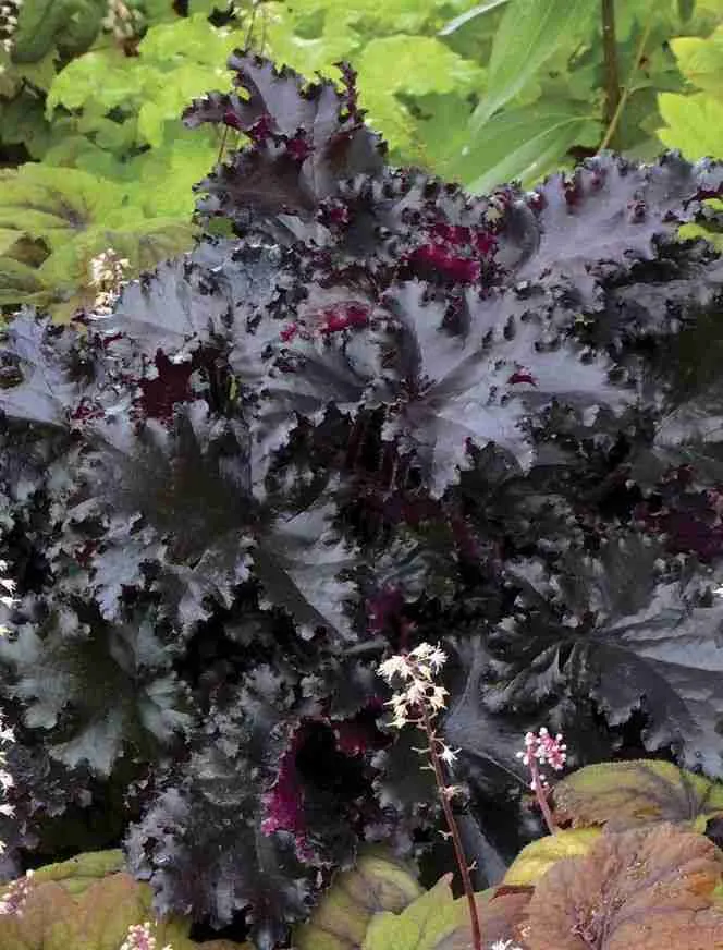 Гейхера сорта *Black Taffeta* пленяет взор своей изысканной декоративностью и утончённой красотой. Листья её крупные, глубоко рассечённые, словно кружево искусной работы, окрашены в глубокий бархатно-чёрный оттенок с едва уловимым пурпурным отливом, который переливается на солнце подобно драгоценному камню. По краям листовых пластин заметна тонкая серебристо-зелёная кайма, придающая растению особую элегантность и контрастность. Цветки гейхеры собраны в рыхлые метельчатые соцветия нежно-розового цвета, возвышающиеся над листвой на тонких прочных стеблях высотой до полуметра. Растёт медленно, формируя компактную плотную куртину диаметром около 45 см, устойчива к неблагоприятным условиям среды, прекрасно переносит полутень и засуху, сохраняя свою привлекательность весь сезон вплоть до заморозков.