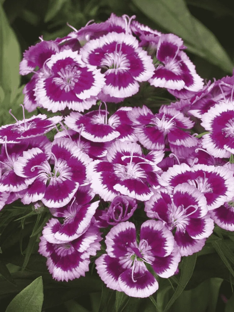 Гвоздика турецкая сорта *Barbarini Purple Picotee* пленяет взор изысканным сочетанием благородной пурпурной окраски лепестков с нежнейшей белоснежной каймой, словно художник тонкой кистью провёл границу между двумя оттенками. Её прямостоячие стебли достигают высоты около полуметра, увенчанные крупными махровыми цветами диаметром до восьми сантиметров, источающими тонкий аромат, который наполняет сад волшебством летних дней. Листья узколанцетные, тёмно-зелёные, гладкие и блестящие, подчёркивая контрастность соцветий. Цветёт обильно и продолжительно, начиная с конца мая и вплоть до середины июля, радуя глаз пышностью и элегантностью своего цветения. Предпочитает солнечные места и плодородную почву, легко размножается семенами и черенкованием, быстро адаптируясь к условиям средней полосы России и украшая собой клумбы, бордюры и миксбордеры.