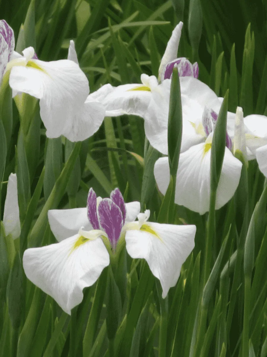 Ирис мечевидный *Queens Tiara* пленяет взор изысканной элегантностью своего облика. Листья длинные, узколинейные, ярко-зелёные, словно мечи, устремлённые вверх, придают растению стройность и благородство форм. Цветки крупные, диаметром до 15 см, распускаются в конце весны—начале лета, поражают нежной белизной лепестков, украшенных золотисто-жёлтыми штрихами и переливчатым пурпурным центром. Бутоны раскрываются постепенно, создавая эффектную композицию, подчёркивая утончённую красоту каждого цветка. Корневище мощное, горизонтально расположенное, позволяет растению уверенно закрепляться в почве и успешно распространяться вегетативно. Предпочитает влажные плодородные почвы, хорошо освещённые участки, где демонстрирует всю свою декоративную привлекательность.