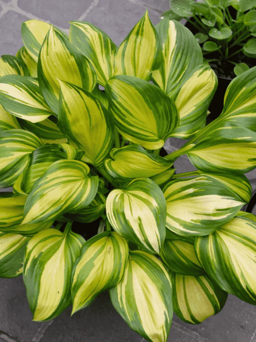 Хоста Rainbow's End очаровывает своей изысканной красотой и элегантностью форм. Это многолетнее травянистое растение образует компактную розетку крупных широколанцетных листьев, достигающих длины до 45 см и ширины около 18 см. Листья имеют насыщенно-зелёную кайму шириной примерно 6-7 мм, плавно переходящую в ярко-жёлтый центр, который постепенно светлеет от основания к верхушке листа, создавая эффект градиента. Поверхность листовых пластин гладкая, слегка блестящая, придающая растению благородство и утончённость. Цветоносы высотой до 90 см несут небольшие светло-фиолетовые цветки колокольчатой формы, собранные в рыхлые кисти, украшая собой садовый пейзаж во второй половине лета. Растёт медленно, формируя плотные кустики диаметром около 60 см, предпочитает полутень и влажные плодородные почвы, прекрасно дополняя теневые композиции и рокарии своим декоративным обликом.