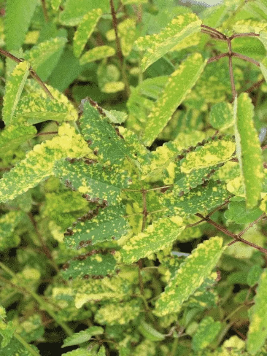 Кровохлебка сортовая **Lemon Splash** пленяет взор изысканным контрастом золотисто-жёлтых пятен на изумрудной зелени листвы, словно солнечные блики легли на поверхность широких сердцевидных листочков, создавая неповторимую игру света и тени. Листья крупные, слегка волнистые по краям, образуют пышную розетку высотой до полуметра, украшая садовые композиции своей живописностью и элегантностью. Цветёт растение обильно мелкими белыми цветами, собранными в рыхлые метельчатые соцветия, возвышающиеся над листьями подобно воздушному облаку, наполняя пространство тонким ароматом свежести и чистоты. Предпочитает полутень и влажные плодородные почвы, легко адаптируется к различным условиям произрастания, радуя глаз своим декоративным обликом долгие годы.