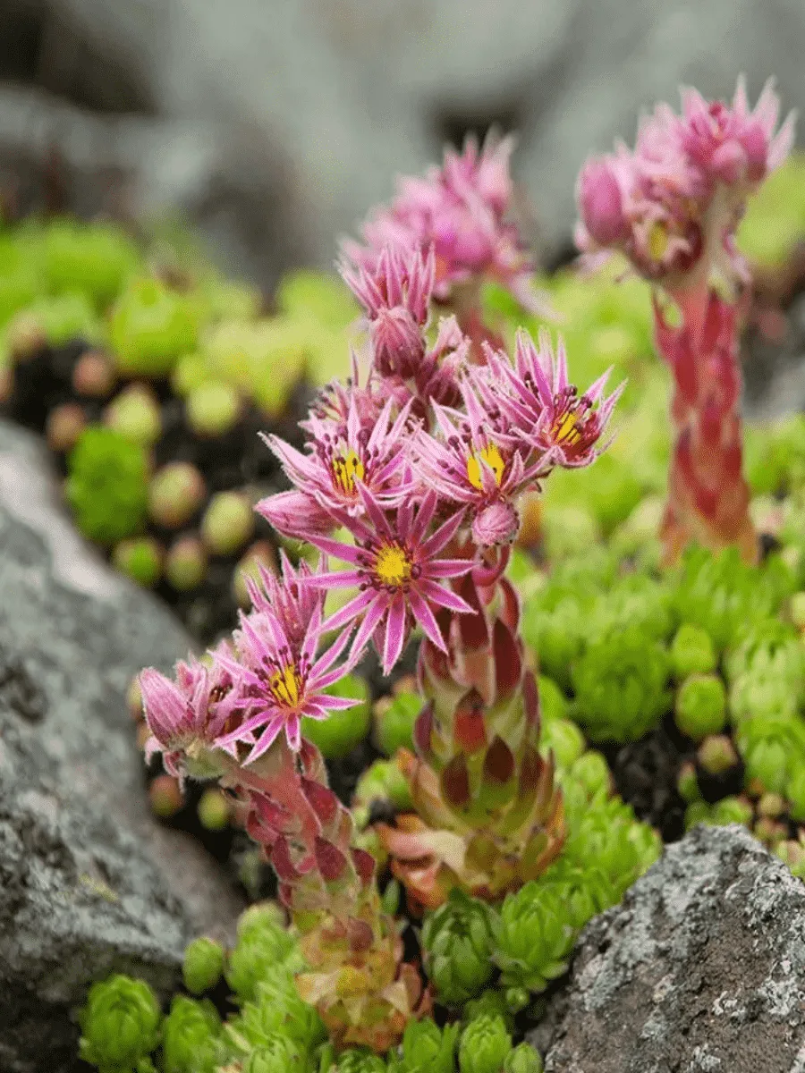 Молодило горное (Sempervivum montanum), известное также как каменная роза, представляет собой вечнозелёное многолетнее растение семейства Толстянковые, покорившее сердца садоводов своей неприхотливостью и декоративностью. Это компактное суккулентное растение образует плотные розетки мясистых зелёных листьев, покрытых нежной серебристо-сизоватой восковой пылью, придающей листьям бархатистый блеск. Листья имеют яйцевидную форму, слегка вытянутые и закруглённые на концах, плотно прилегают друг к другу, создавая впечатление миниатюрных цветков. Цветёт молодило небольшими звёздчатыми цветами жёлтого оттенка, собранными в рыхлые соцветия-зонтики, возвышающиеся над листьями на тонких прочных стеблях высотой до 15 см. Растение предпочитает каменистые почвы и солнечные места, легко размножается дочерними розетками, укореняющимися рядом с материнским растением, благодаря чему быстро разрастается, покрывая поверхность земли живописными коврами. Благодаря способности накапливать влагу в тканях, оно прекрасно переносит засуху и суровые условия горных районов Европы, где встречается преимущественно на скалах и осыпях.
