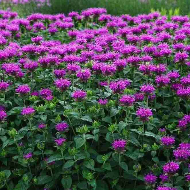 Монарда гибридная сорта *Prairienacht* пленяет взор своей изысканной красотой и благородством форм. Это многолетнее травянистое растение достигает высоты от 60 до 90 сантиметров, обладая крепким прямостоячим стеблем и крупными ароматными листьями насыщенного зелёного цвета с зубчатым краем, придающим растению особую декоративность. Листья расположены супротивно, имеют овально-ланцетную форму и слегка морщинистую поверхность, источающую приятный лимонно-мятный запах при прикосновении. Цветки монарды собраны в плотные головчатые соцветия диаметром около 5–7 см, состоящие из множества мелких трубчатых цветков тёмно-фиолетового оттенка, почти чёрного тона, контрастирующих с яркими золотистыми тычинками, выступающими наружу и привлекающими внимание насекомых-опылителей. Период цветения продолжительный, начинается в июле и длится до конца августа, украшая садовые композиции своими живописными красками и создавая атмосферу таинственности и очарования. Растёт быстро, легко размножается делением куста и семенами, предпочитает солнечные места с плодородной почвой и умеренным поливом, устойчива к болезням и вредителям, прекрасно зимует даже в суровых климатических условиях средней полосы России.