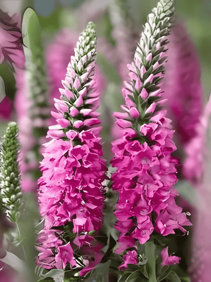 Веронника колосистая сорта *Bubblegum Candles* пленяет взор нежностью пастельных оттенков и утончённой грацией облика. Это многолетнее растение образует компактную розетку прикорневых листьев насыщенно-зелёной окраски, слегка волнистых по краю и покрытых едва заметным пушком. Из центра розетки поднимаются стройные прямостоячие стебли высотой до полуметра, увенчанные плотными цилиндрическими соцветиями-колосками длиной около десяти сантиметров. Цветки мелкие, многочисленные, собраны густо друг к другу, создавая впечатление сплошного бархатистого облачка нежно-розового цвета, словно лепестки окутаны утренней дымкой. Период цветения продолжительный, начинается в июне и длится до конца лета, наполняя сад тонким ароматом свежести и лёгкости. Растёт быстро, легко размножается делением куста и семенами, предпочитая солнечные места с плодородной почвой умеренной влажности. Благодаря своей неприхотливости и декоративности широко используется в миксбордерах, рокариях и бордюрах, украшая сады изысканной простотой и природной элегантностью.