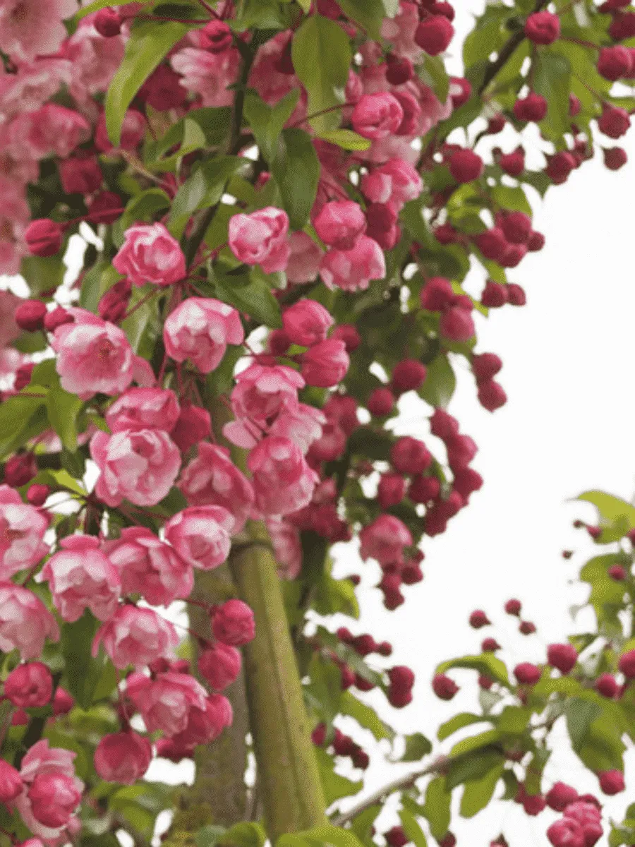 Декоративная яблоня сорта Ван Эслтин (Van Eseltine), покоряет сердца садоводов своей утончённой красотой и элегантностью форм. Это компактное дерево средней высоты, достигающее около четырёх метров, обладает раскидистой кроной с тонкими ветвями, устремлёнными вверх, словно нежные руки балерины. Листья округлые, слегка гофрированные, насыщенно-зелёного цвета летом и приобретающие яркие оттенки оранжевого и красного осенью, создавая живописную палитру красок. Особенное очарование дереву придаёт пышное весеннее цветение: крупные розовые бутоны раскрываются в белоснежные ароматные цветы, собранные в рыхлые соцветия, украшая сад изысканным шармом. Растение отличается устойчивостью к неблагоприятным условиям среды, хорошо переносит обрезку и формирование кроны, легко адаптируется к различным типам почв и климатическим зонам умеренного пояса. Благодаря своим декоративным качествам и неприхотливости, яблоня Ван Эслтин широко используется в ландшафтном дизайне парков, скверов и частных участков, даря радость созерцания её великолепной красоты каждому новому сезону.